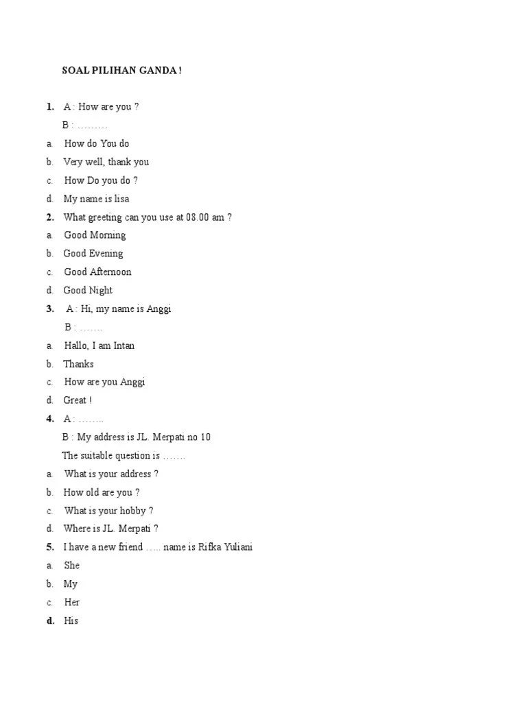 Contoh soal tentang greeting and introduction telah kami sampaikan kepada anda mulai dari soal pilihan ganda soal essay dan soal uraian. He expressions of thanking complimenting and . Kali ini memberikan lebih dari 560 soal untuk kamu, blog ini menyediaan contoh soal pilihan ganda dan essay untuk kelas 10, 11, . Contoh soal introduction kelas 10. Inggris dalam bentuk pg pilihan ganda yang berisikan materi yang sama dengan contoh soal essay b.