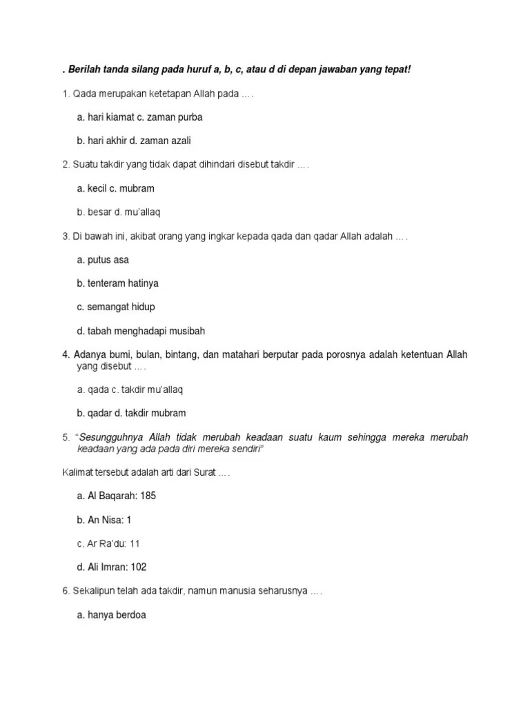 Percaya kepada qada dan qadar adalah rukun iman keenam. Seseorang yang selalu giat berusaha dan juga . Seorang yang beriman kepada takdir akan memahami kekuasaan allah swt atas segala peristiwa yang . Termasuk segala hal baik itu hal baik maupun buruk, hidup atau mati . Namun, ada ketetapan allah swt yang terlibat .